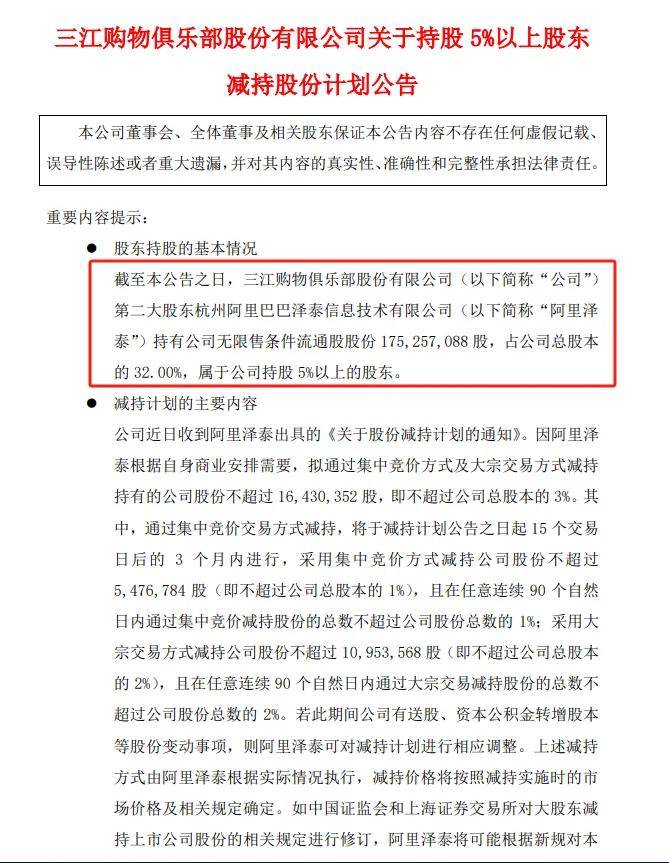 4月21日,三江购物(601116.SH)发布公告称,其第二大股东杭州阿里巴巴泽泰信息技术有限公司(下称“阿里泽泰”)计划减持不超过1643万股,占总股本的3%,套现约1.94亿元(按4月22日收盘价计算)。这是阿里巴巴自2016年入股三江购物以来的首次减持,标志着阿里在传统实体零售领域的战略收缩进入新阶段。