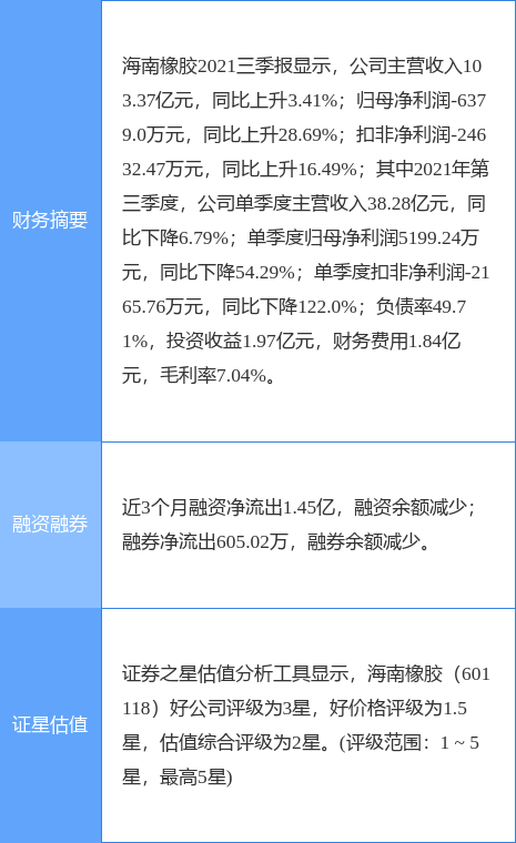 海南橡胶披露年报,2021年实现营业收入153.33亿元,同比下降2.61%;归属于上市公司股东的净利润1.51亿元,同比增长111.99%。基本每股收益0.0352元,拟每10股派发现金股利0.106元(含税)。