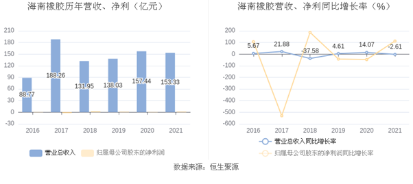 海南橡胶(601118)4月11日披露2021年年度报告。2021年,公司实现营业收入153.33亿元,同比下降2.61%;归母净利润1.51亿元,同比增长111.99%;扣非净利润亏损2.33亿元,上年同期亏损8857.29万元;经营活动产生的现金流量净额为2.66亿元,同比下降43.31%;报告期内,海南橡胶基本每股收益为0.04元,加权平均净资产收益率为1.57%。公司2021年度分配预案为:拟向全体股东每10股派0.106元(含税)。