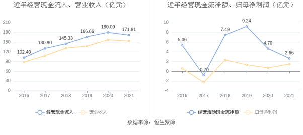 截至2021年末,公司经营活动现金流净额为2.66亿元,同比下降43.31%;筹资活动现金流净额-5.33亿元,同比减少10.14亿元;投资活动现金流净额-1.76亿元,相比上年同期增加11.12亿元。