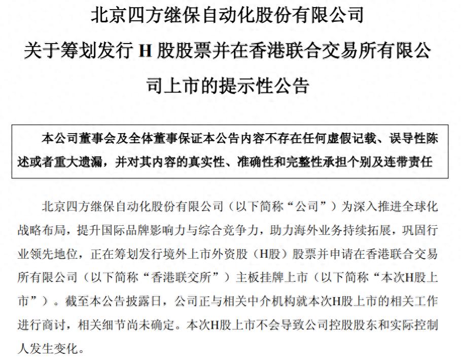 瑞财经王敏 4月13日,北京四方继保自动化股份有限公司(以下简称“四方股份”)发布公告称,为深入推进全球化战略布局,提升国际品牌影响力与综合竞争力,助力海外业务持续拓展,巩固行业领先地位,正在筹划发行境外上市外资股(H股)股票并申请在港交所主板挂牌上市。