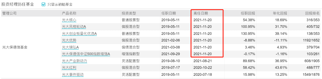 截图所提到的基金经理,在2021年11月20日突然离任所有产品。