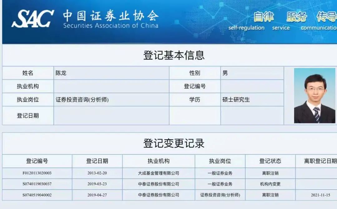 根据中国证券业协会的最新信息,陈龙已经于2021年11月15日在中证协进行了离职登记,从中泰证券正式离职。