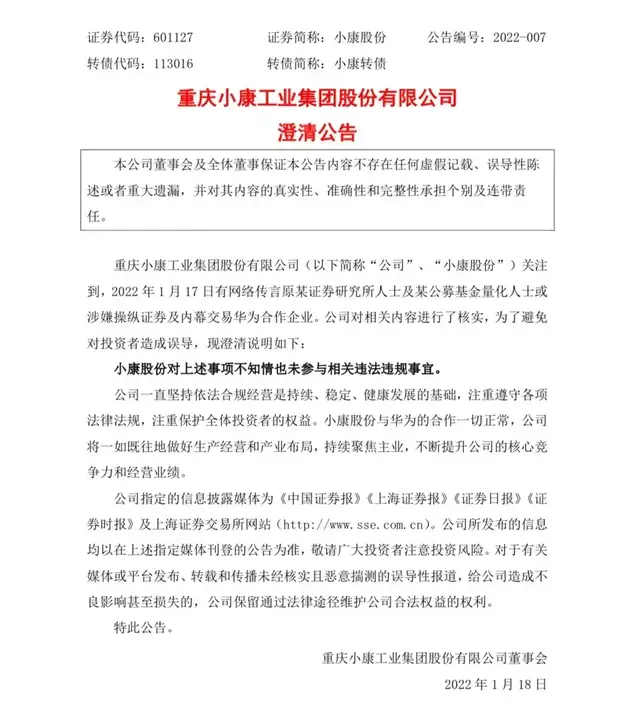 面对此质疑,18日早些时间,小康股份紧急公告澄清,公司对相关内容进行了核实,对上述事项不知情也未参与相关违法违规事宜。小康股份在公告中表示,公司一直坚持依法合规经营是持续、稳定、健康发展的基础,注重遵守各项法律法规,注重保护全体投资者的权益。小康股份与华为的合作一切正常,公司将一如既往地做好生产经营和产业布局,持续聚焦主业,不断提升公司的核心竞争力和经营业绩。截至记者发稿时,有消息宣称涉事20多人的小团体均被抓。