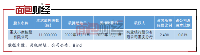 近日,小康股份控股股东小康控股再次质押公司股份1100万股,占其所持公司股份比例为2.48%。质押时间为2022年1月21日至12月1日,质权人为兴业银行股份有限公司重庆分行。