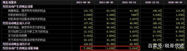 “小康股份”2016年至2020年经营现金流均为净流入,经营带来现金净流入年均9.36亿,但是自2021年一季度开始经营现金流为负,2021年经营已经无法带来现金正流入!