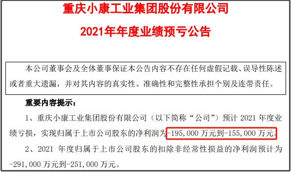 “小康股份”自2020年一季度至2021年四季度,连续8个季度亏损!2020年归属净利润累计亏损17.29亿元,2021年归属净利润累计亏损15.5亿至19.5亿(扣非后,实际经营亏损25.1亿至29.1亿)!亏损面进一步扩大!