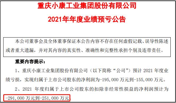小康股份2021年全年扣除非经常损益后,经营预计亏损25.1亿至29.1亿!亏损的主要原因是:①传统燃油车销量下滑,并且原材料上涨导致毛利率下滑,2021年该业务归属净利润亏损约3.5亿;②新能源车虽然销量增长104.39%,但是基数太低,还在销量释放阶段;目前的新能源车销量远远跟不上“固定资产、无形资产摊销增大,研发投入、人工成本、营销渠道建设费用的增加”,2021年该业务归属净利润亏损约14亿!