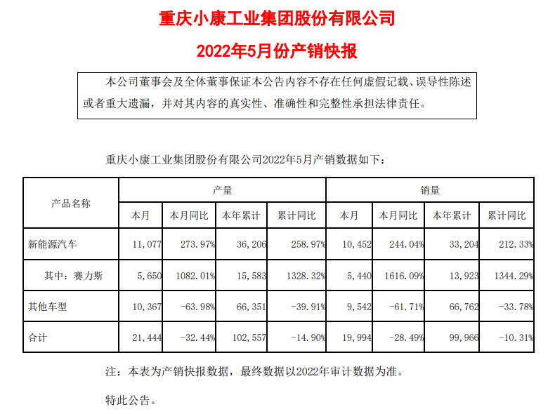 中国网汽车6月10日讯记者日前从官方获悉,小康股份发布2022年5月份产销快报。据统计,5月份,小康股份汽车整车销量为19994辆,同比减少28.49%;今年1-5月份累计销量为99966辆,同比减少10.31%。