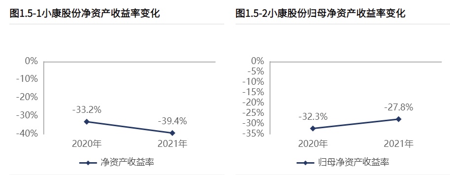 2021年小康股份净资产收益率-39.42%,归母净资产收益率-27.80%,公司亏损,未为股东带来价值增长。