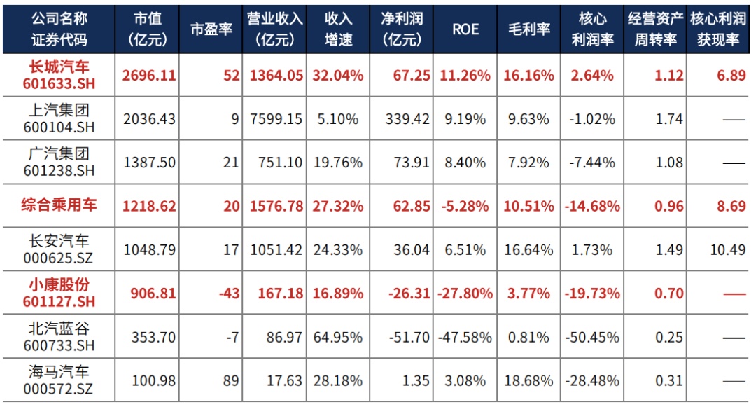 2021年报小康股份核心利润持续亏损,长城汽车核心利润增速-21.56%。