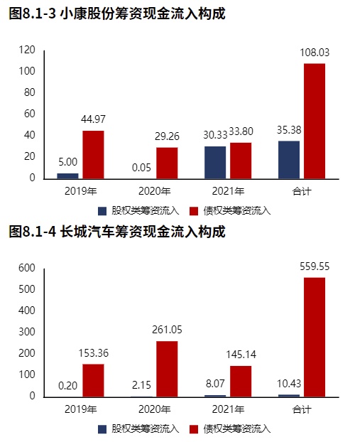 2021年报小康股份筹资活动现金流入74.75亿元,其中股权流入30.33亿元,债权流入33.80亿元,债权净流出1.42亿元,公司扩大股权,并开始进行历史债务的偿还。