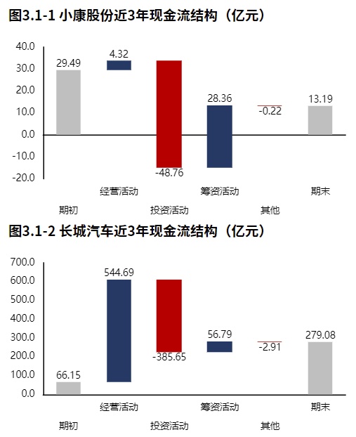 从小康股份2021年报的现金流结构来看,期初现金9.35亿元,经营活动净流出9.87亿元,投资活动净流出15.63亿元,筹资活动净流入29.36亿元,累计净流入3.84亿元,期末现金13.19亿元。