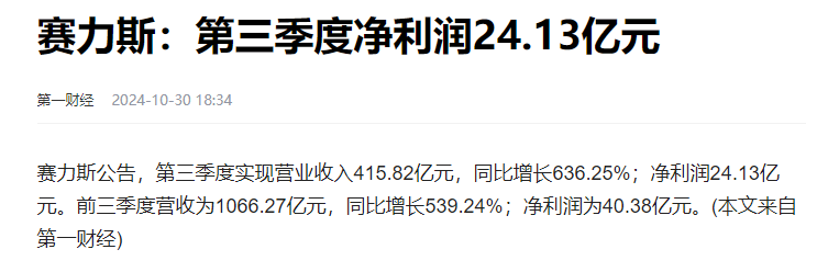 不过,赛力斯在最新的财报公告中解释了第三季度利润大增的原因,并没有直接提及华为的品牌赋能。