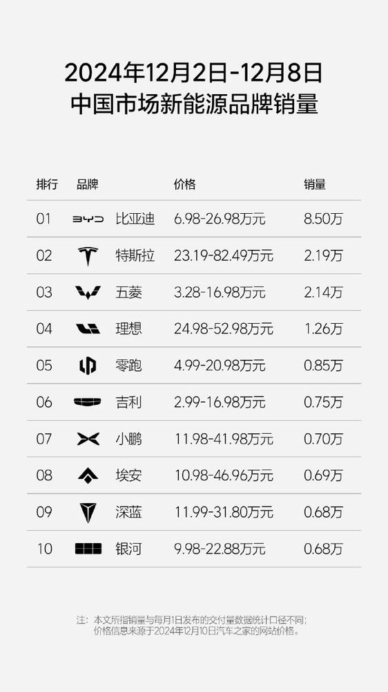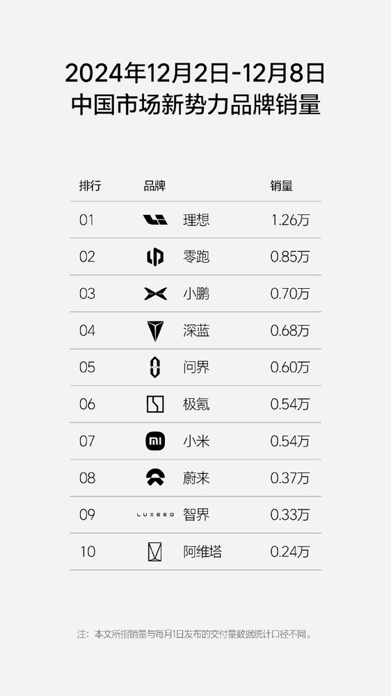 数据显示,2024年第49周(12.2-12.8),中国造车新势力销量前十分别为:理想汽车(1.26万辆)、零跑汽车(0.85万辆)、小鹏汽车(0.70万辆)、深蓝汽车(0.68万辆)、问界汽车(0.60万辆)、极氪汽车(0.54万辆)、小米汽车(0.54万辆)、蔚来汽车(0.37万辆)、智界汽车(0.33万辆)、阿维塔汽车(0.24万辆)。
