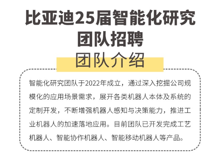 2024年12月初,比亚迪发布“25届具身智能研究团队专场招聘”信息,招聘人才研究方向涉及人形机器人等。据比亚迪方面介绍,目前,其团队已开发完成工艺机器人、智能协作机器人、智能移动机器人、类人形机器人等产品。