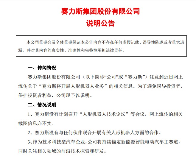 在《说明公告》中,赛力斯不仅辟谣了外界关于其召开“人形机器人技术论坛”会议传言内容,还明确赛力斯没有与任何伙伴联合开展有关人形机器人方面的合作。“目前,没有关于公司布局人形机器人的消息。”上述赛力斯相关工作人员表示。