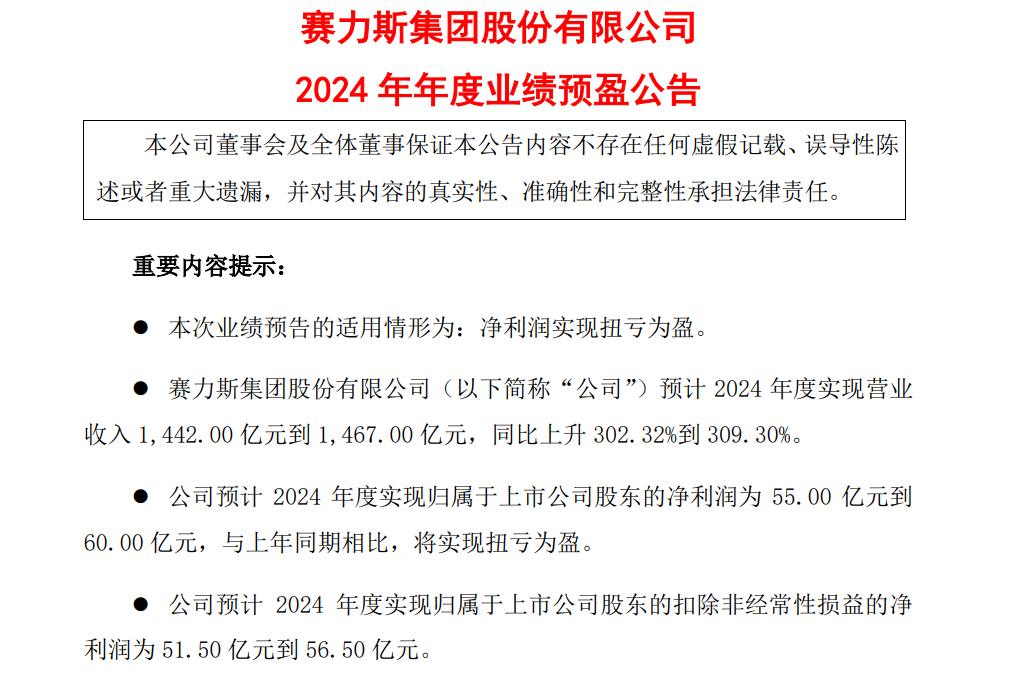 近日,赛力斯发布2024 年年度业绩预盈公告,预计 2024 年度实现营业收入1442亿元到1467亿元,同比增长302.32%到309.30%;归属于上市公司股东的净利润预计将达到55亿元至60亿元,同比扭亏为盈。此外,扣非净利润也预计将在51.5亿元至56.5亿元之间。