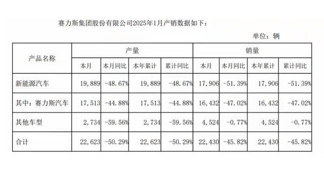 实在让人感到诧异,一向表现出彩的赛力斯新能源汽车的销量居然呈现出同比、环比双双下滑的态势。而且,2025年1月份,其销量同比降幅、环比降幅,均超过了50%。