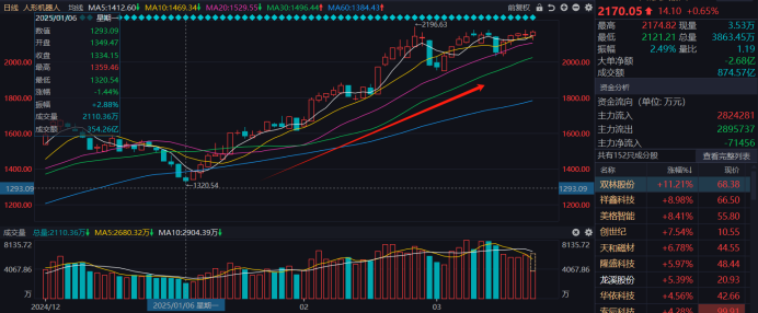 毕竟根据同花顺的人形机器人板块和汽车零部件板块涨幅来看,年初至今该板块的区间涨幅最高已经分别超过了66%和45%,这两个板块短期翻几倍的牛股不胜枚举,基本上能与人形机器人产业链挂上钩的上市公司都出现了比较可观的涨幅,而且趋势还在。