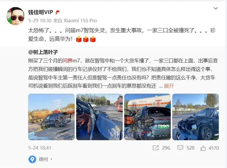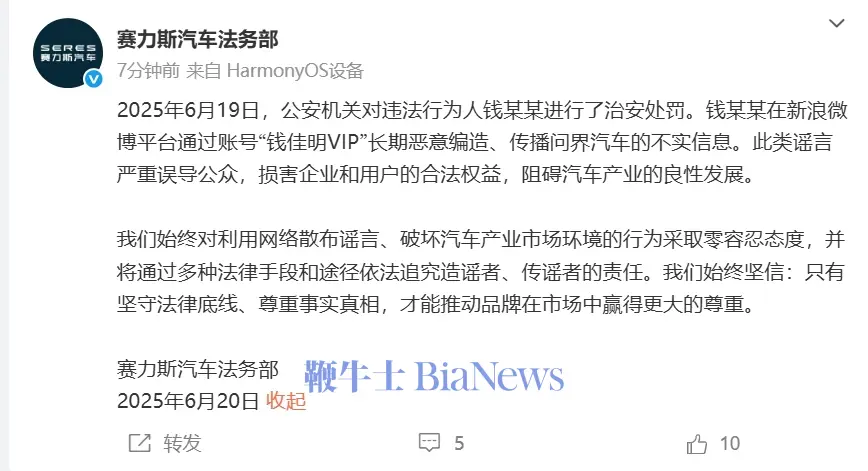 6月20日,赛力斯法务部发文,称钱某某在新浪微博平台通过账号“钱佳明VIP”长期恶意编造、传播问界汽车的不实信息。