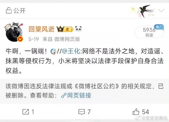 5月19日,小米法务部发布的一起涉及网络黑公关案件的通报微博已不可见,其他用户的转发内容显示“该微博因违反法律法规或《微博社区公约》的相关规定,已被删除”,小米集团高管雷军和王化此前对该微博的转发也已消失。