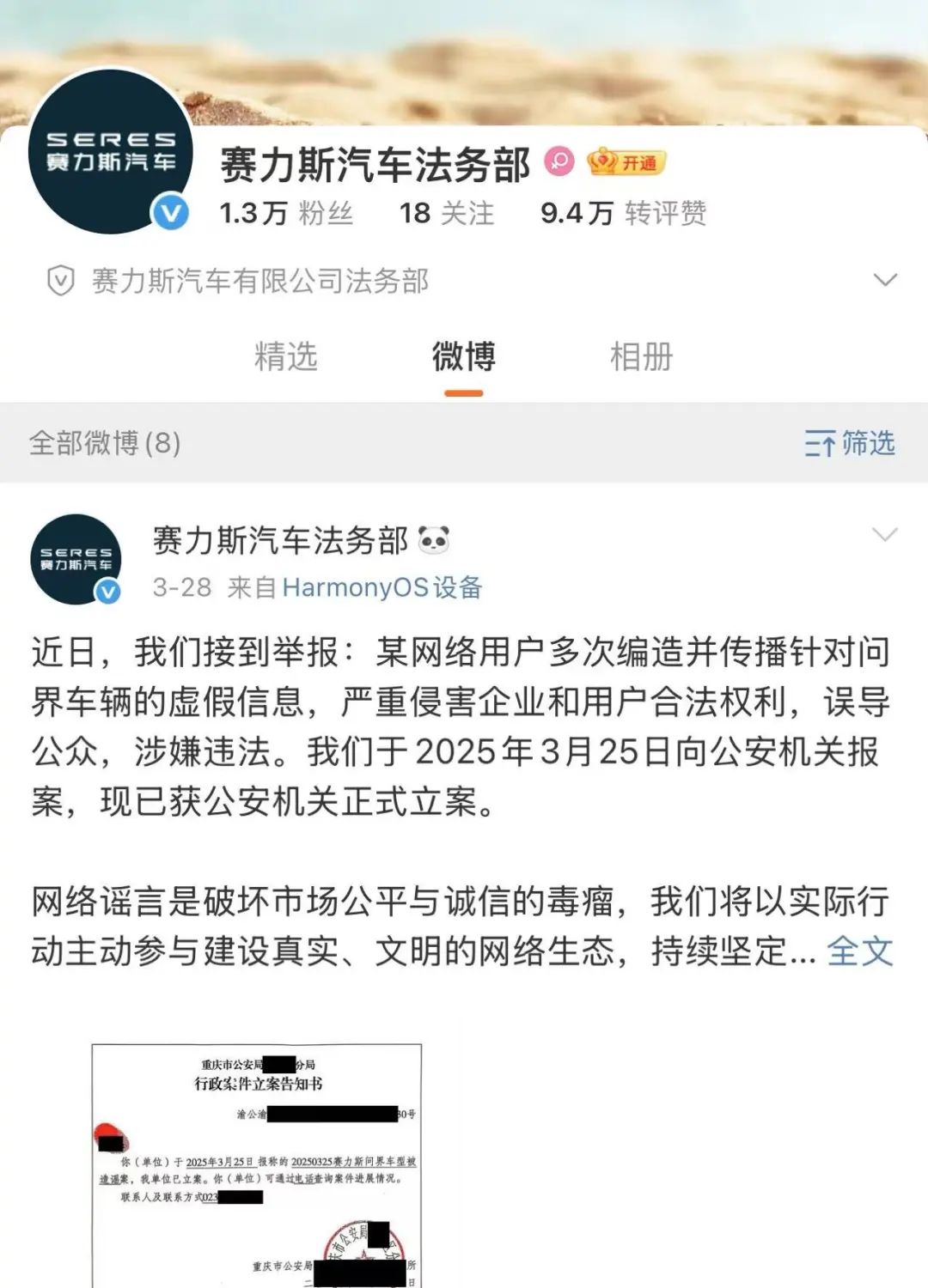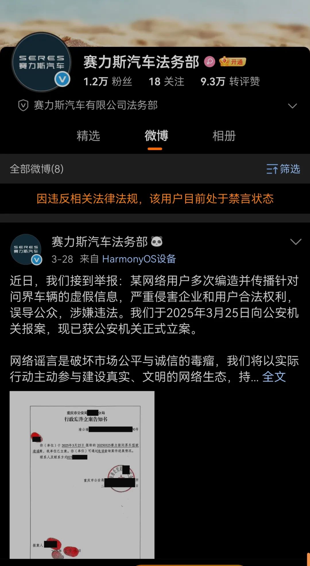 目前,赛力斯汽车法务部微博账号禁言已经解除。