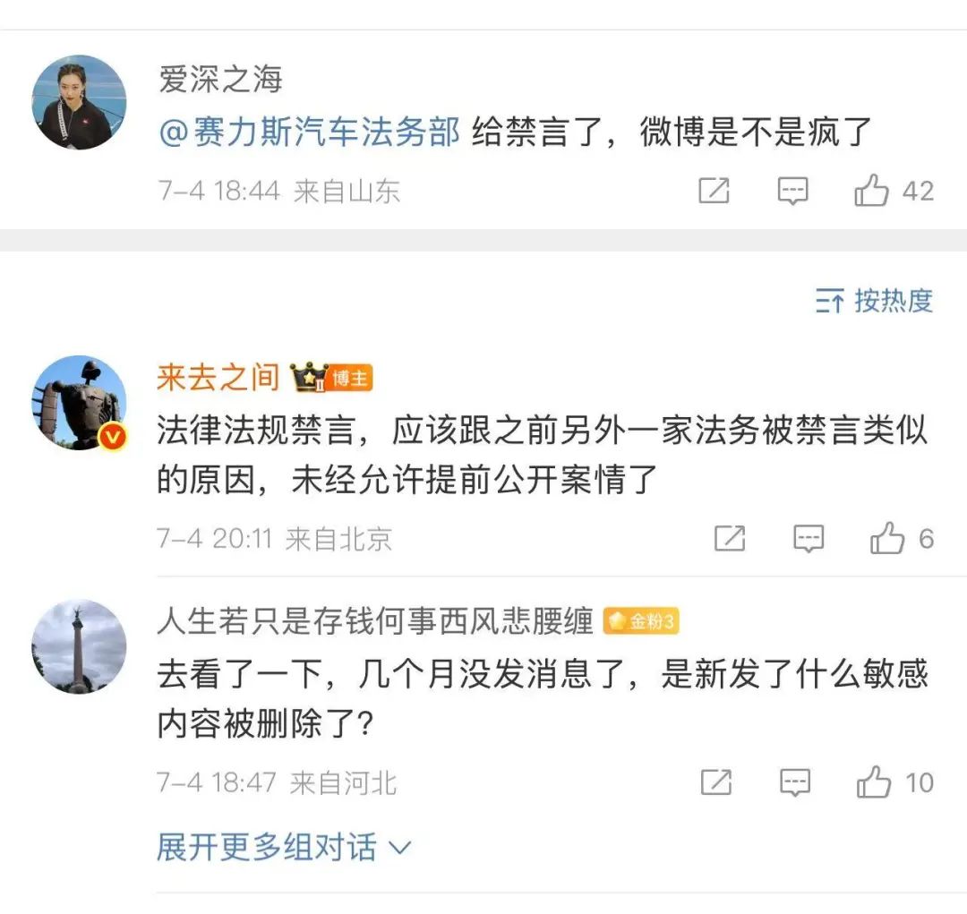 7月4日,赛力斯汽车法务部官方微博账号因违反相关法律法规被禁言。