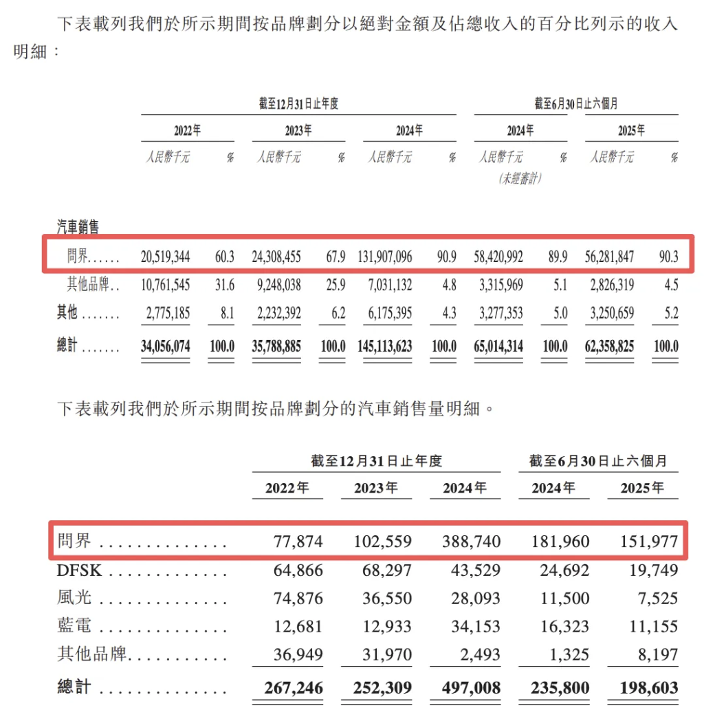 渐渐的弊端开始显现,今年前9月,问界系列贡献了七成以上的销量,对应营收占比90.3%。但随着华为鸿蒙智行生态的扩张,赛力斯的“专宠”优势被加速分流,华为先后与奇瑞、北汽、江淮等车企合作,推出智界、享界、尊界等品牌,形成“五界”军团,赛力斯能否继续吃到最大的“华为红利”,存在不确定性。