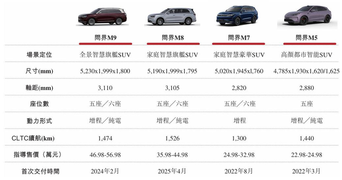 时间来到2021年,赛力斯与华为达成跨界合作并发布核心品牌“问界”。截至目前,已推出问界M5、问界M7、问界M8和问界M9四款车型,产品价格在20万元至50万元区间,通过差异化定位实现对不同市场的覆盖。