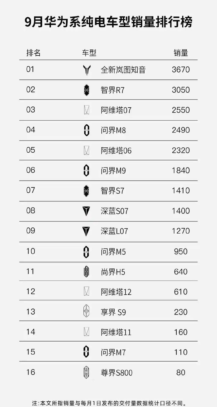 根据媒体统计的9月华为系纯电车型销量排行榜,全新岚图知音以3670辆的成绩跃居榜首,智界R7、阿维塔07紧随其后,销量均突破2500辆大关,而赛力斯今年新发布的车型问界M8则位列第四名。