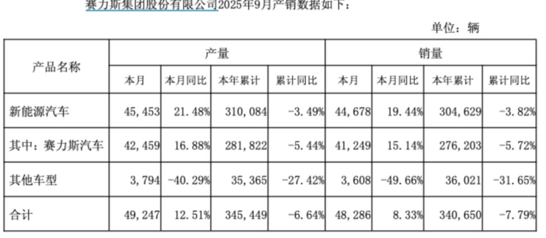 市场表现方面,下滑趋势更为明显。2025年前9个月,赛力斯品牌累计销售汽车27.62万辆,同比减少5.72%;问界系列销量26.36万辆,同比下跌8.9%,使其成为新势力阵营中除理想汽车外唯一下滑的品牌。