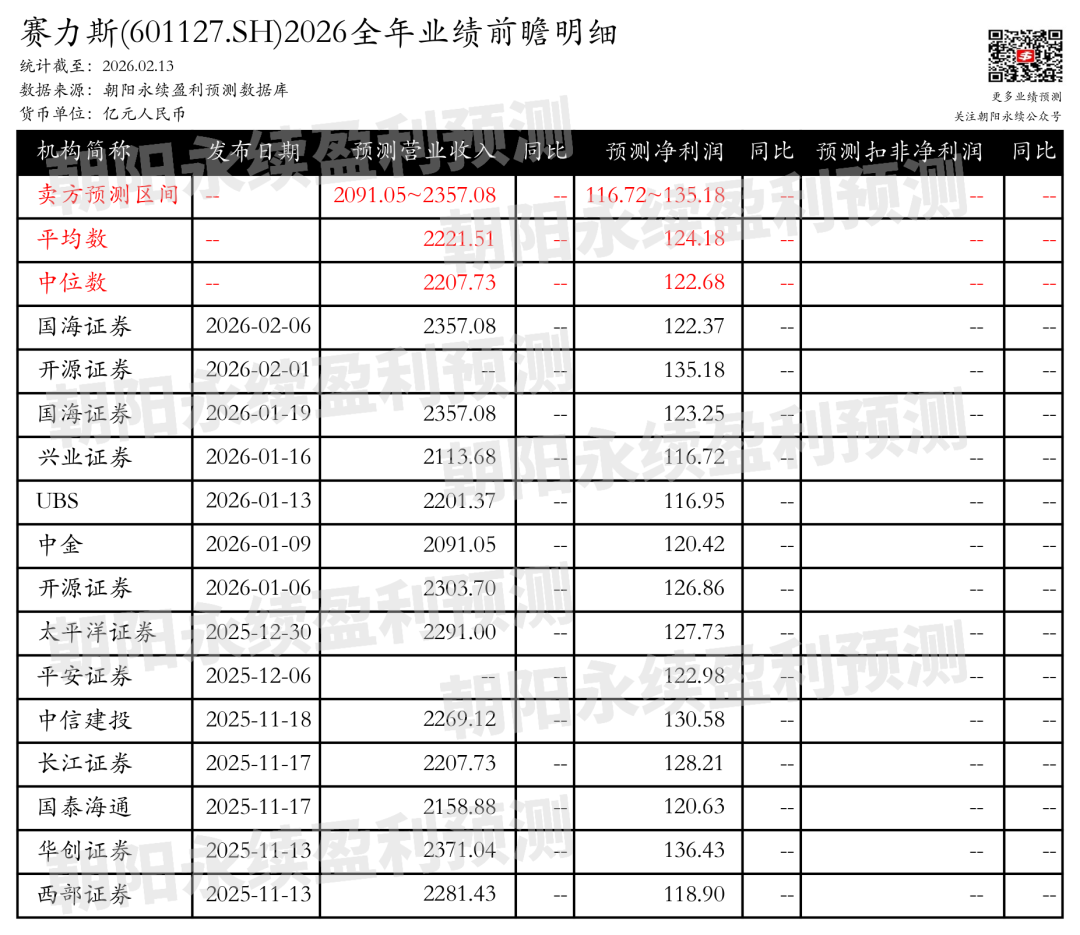 国海证券认为:赛力斯在2026年1月新能源汽车销量同比大幅增长,达到43,034辆,其中赛力斯汽车销量为40,012辆,同比增长143.50%。公司与华为合作的问界品牌在鸿蒙智行体系中占据69%的交付量,成为销量主力。预计2026年推出的全新SUV_M6有望延续爆款趋势,进一步推动公司销量和营收增长。
