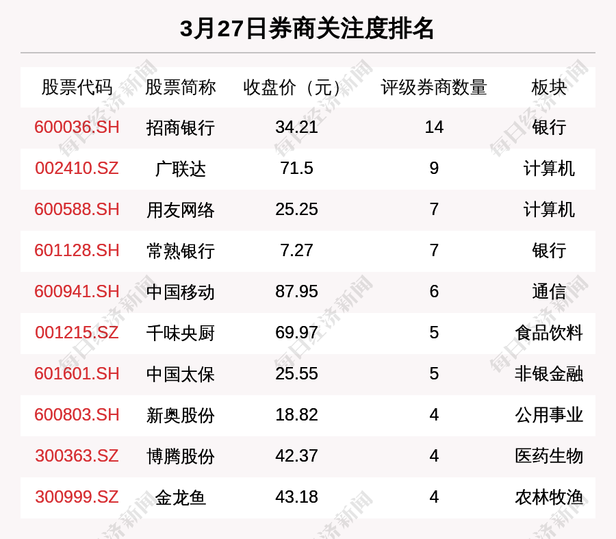 从券商对个股的关注程度来看,有49只个股获得多家券商关注,券商关注数量排名居前的个股是招商银行(600036.SH)、广联达(002410.SZ)、用友网络(600588.SH)。