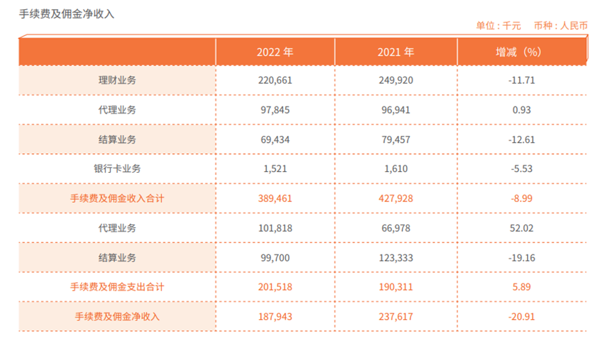 而非息收入中,手续费及佣金净收入则出现明显下滑,同比减少20.91%至1.88亿元。其中,除代理业务同比微增外,理财业务、结算业务、银行卡业务收入较2021年均有所下降。