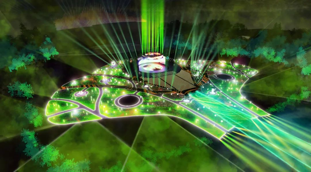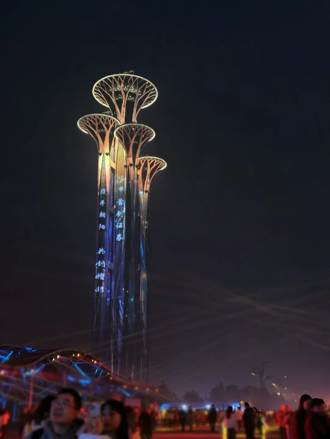 奥林匹克塔的观景平台是俯瞰中轴线与主仪式区“生命之树”的最佳场所,“生命之树”树干连接着中轴线与主会场,树冠由绚烂多姿的灯光艺术作品编织而成,一颗熠熠生辉的“生命果实”孕育其中,不仅是对生命能量生生不息的深刻诠释,更是对“人类命运共同体”的诗意表达,以科技与灯光完美融合的蓬勃之姿,展现“五宜”朝阳的非凡魅力。
