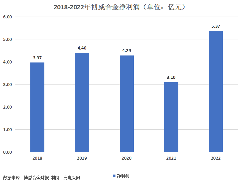 2018—2022年,博威合金净利润分别为3.97亿元、4.40亿元、4.29亿元、3.10亿元和5.37亿元,同比增长29.79%、10.97%、-2.54%、-27.66%和73.11%。