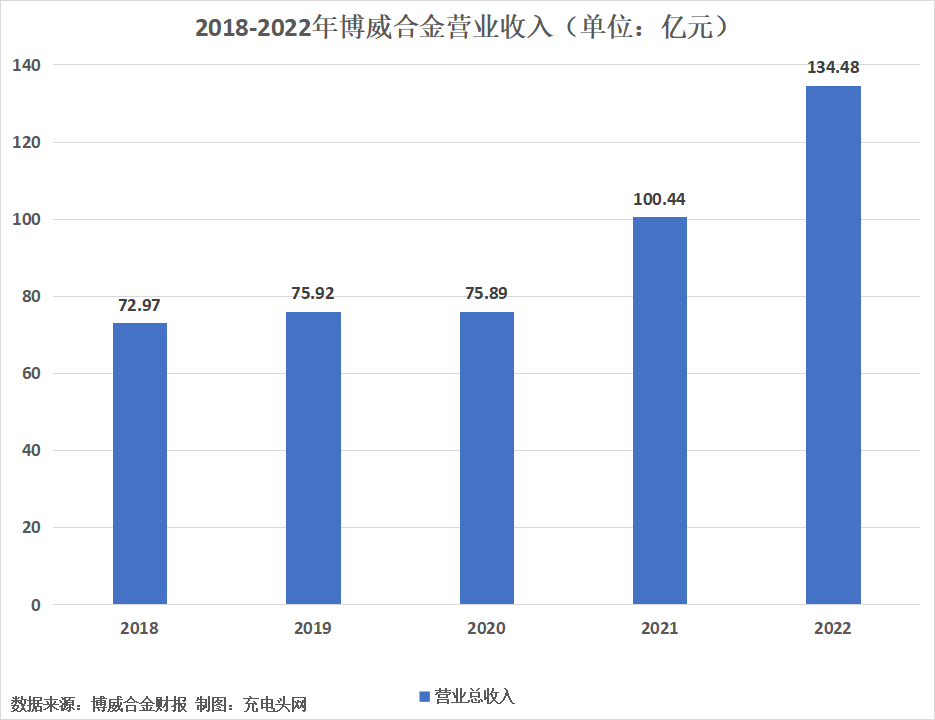 根据博威合金报告数据显示,2018-2022年,博威合金营业收入分别为72.97亿元、75.92亿元、75.89亿元、100.44亿元和134.48亿元,同比增长26.74%、4.03%、-0.04%、32.36%和33.89%。