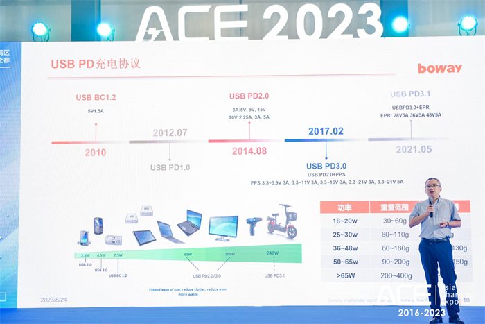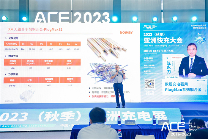 8月23-25日,2023(秋季)亚洲充电展在深圳会展中心(福田)3号馆成功举办。作为各大电源企业发布新品和展示技术的平台,展会覆盖快充、无线充、储能、新能源等领域,旨在推动构建产业间的协同发展。8月23日,“2023(秋季)亚洲快充大会”于展会同期召开。会议汇集众多行业专家,共商新形势下快充技术的发展前景。会上,材料学博士、高级工程师,同时也是博威合金(601137. SH)棒材技术市场部高级经理陈永力,以《欧规充电器用PlugMax系列铜合金》为题,与现场同仁深入交流大功率发展趋势下,大克重充电器应用难题及相应部件选材要点,并分享了博威合金PlugMax系列解决方案。