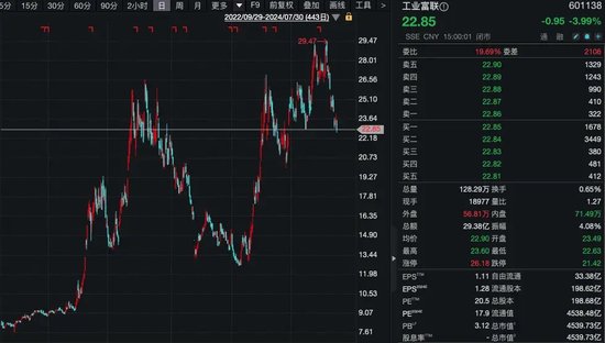 7月中旬以来,工业富联(601138)股价结束了今年上半年持续拉涨的势头,开始下行。截至7月30日盘中,该公司股价最低报22.63元/股,为近三个月低点,半个多月来累计最大跌幅超过23%。