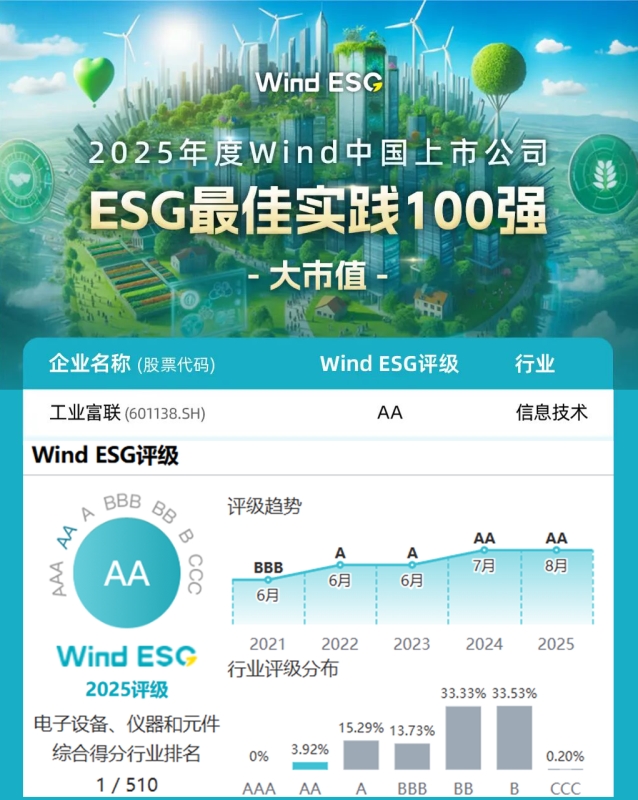 近日,2025年度Wind中国上市公司"ESG最佳实践100强"榜单发布。工业富联凭借在ESG领域的持续深耕,获得Wind ESG“AA”评级,并连续两年成功登榜,ESG综合评分位列电子设备、仪器和元件行业第一,环境、社会及治理各维度均领先行业水平。