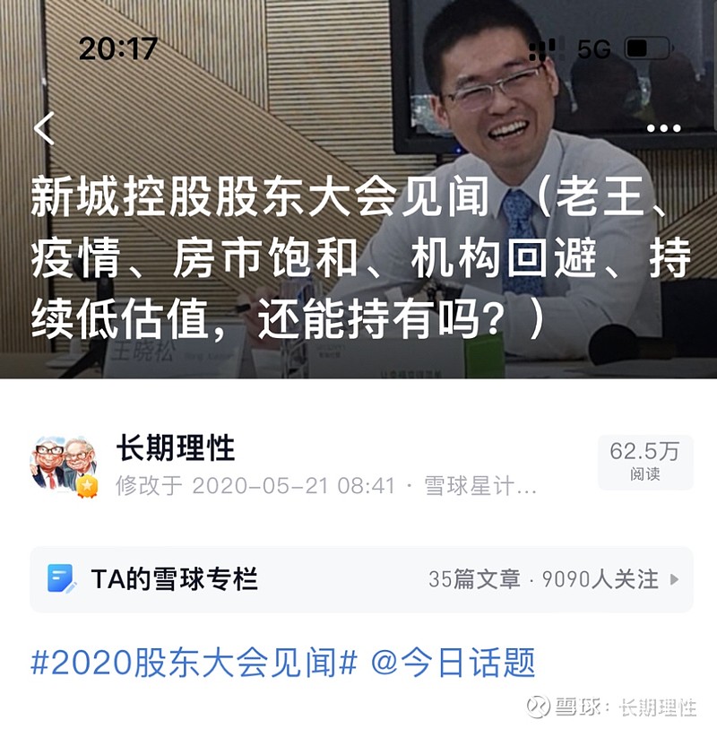 5月22日,第三次现场参加新城控股股东大会了,记得2020年会议室座无虚席70多个股东参会,小王总笑的特别灿烂,会后股东们聚会2大桌都坐不下。