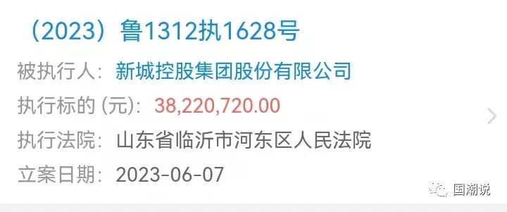 信息显示,2023年6月7日,新城控股集团股份有限公司成为被执行人,执行标的3822万,案号为(2023)鲁1312执1628号。