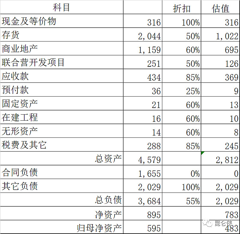 巴菲特的估值方法是对应收账打85折,对存货和固定资产打6折,预付费用等打2.5折,负债不打折。采用这种方法,我们对新城控股也进行估值试试看结果如何。