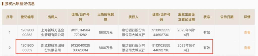 6 月 21 日,新城控股集团股份有限公司出质天津市滨海新区新城悦鑫房地产开发有限公司 8100 万元股权予廊坊银行股份有限公司大城支行,占所持股份比例为 100%,登记日期为 2023-06-14。