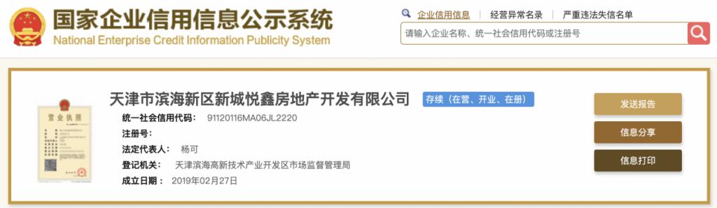 天津市滨海新区新城悦鑫房地产开发有限公司成立于 2019-02-27,法定代表人为杨可,注册资本为 10000 万元,经营范围包含:房地产开发经营;非居住房地产租赁;日用百货销售等。该公司由新城控股集团股份有限公司持股 81%,上海新城万圣企业管理有限公司持股 19%。