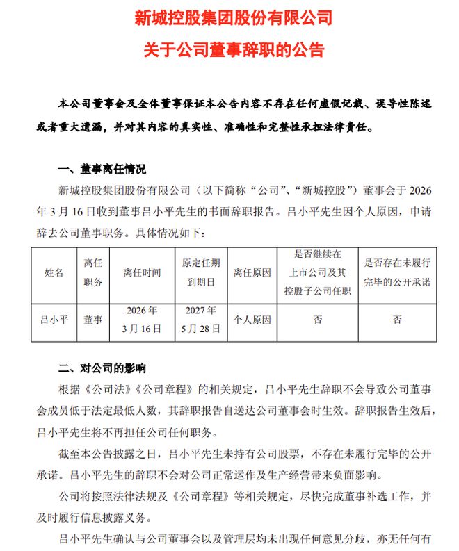 公告披露,新城控股董事会于2026年3月16日收到董事吕小平的书面辞职报告。吕小平因个人原因申请辞去公司董事职务,原定任期至2027年5月28日。辞职报告自送达公司董事会时生效,生效后,吕小平不再担任公司任何职务。截至公告披露日,吕小平未持有公司股票,不存在未履行完毕的公开承诺,辞职不会对公司正常运作及生产经营带来负面影响。