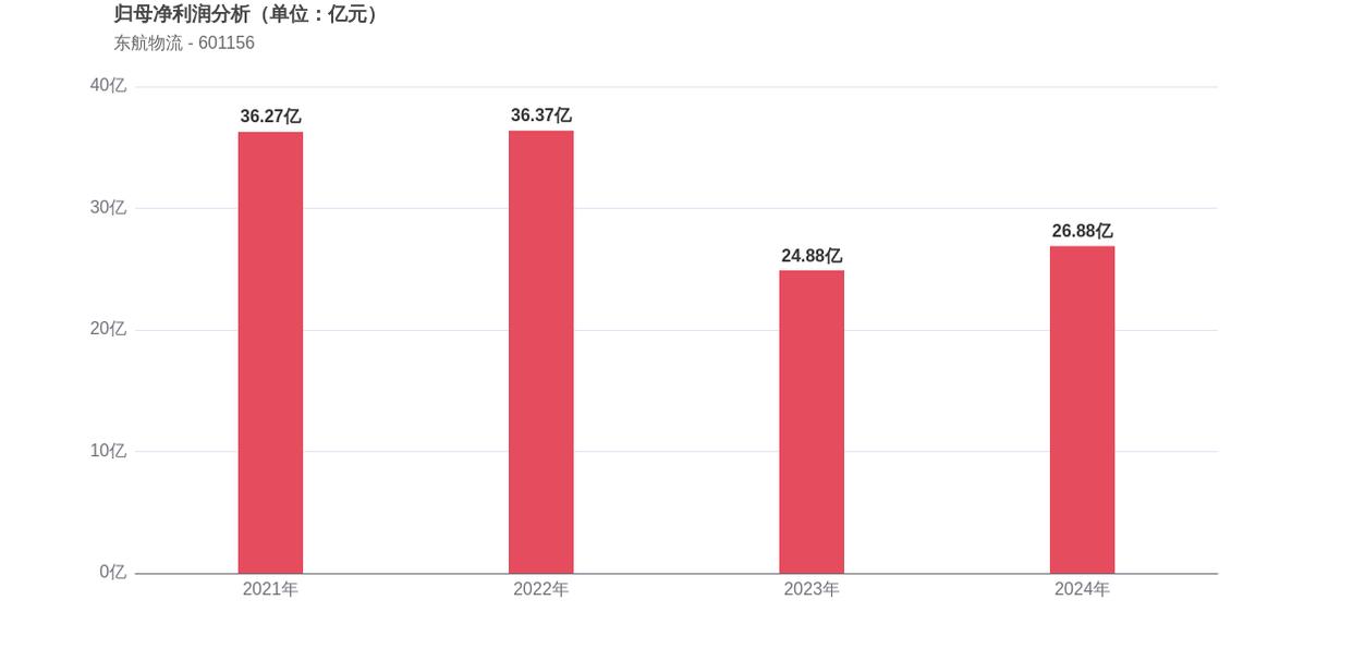 利润角度分析,2021年东航物流实现归母净利润36.27亿元,2024年26.88亿元。利润水平在经历2023年的大幅下滑后,2024年开始企稳回升。