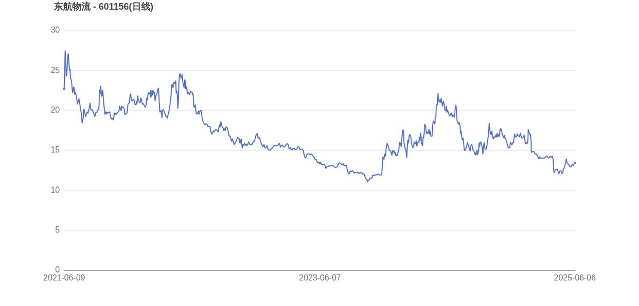 2021年6月15日,东航物流的市值巅峰达到477.70亿元,股价也顺应升至30.09元。而至6月6日收盘,东航物流的股价为13.4元,市值为212.73亿元,相比峰值时期市值减少264.96亿元,市值蒸发了55.47%。