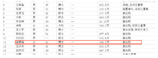 根据东方财富网目前公开的资料显示,翟晨曦的薪酬高达999.3万,差一点就突破上千万,总裁王琳晶为433万,同为副总裁的王晓光薪酬为497.3万,翟晨曦的薪酬近乎他们的两倍。